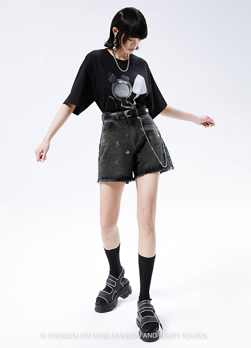 简单款式的牛仔短裤已经不能满足爱美的姑娘了,高腰的复古系带款+基本款T恤,再踏上一双马丁靴,潮或不潮还用说吗?卷边的五分宽松短裤在凉一些的天气也可以内搭打底裤来穿,甜美假小子绝对亮眼!